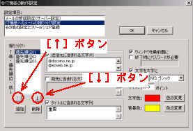 ・メールの振り分け設定の必要性 @付箋紙は指定されたメールアドレス(正確にはメールボックス)からのメールを受信して、それをデスクトップ上に付箋紙として表示するためのソフトウェアです。 しかし、受信したメールをすべて張り付けるならば、人によってはその数が非常に膨大になってしまいます。中には迷惑メール(未承諾広告、スパム)等もメールで届きますので、それらをいちいち付箋紙にしていては面倒です。 それで、メールの振り分けが必要になります。メールの振り分け処理を行えば、付箋紙に張り付けたいメールのみを限定して張り付けることができます。また、メールのタイトルなどに特定の文字が含まれていた場合にのみ優先順位を上げるなどの設定を行うことにより、付箋紙をより効率よく管理できるようになります。 ・メール振り分け設定の方法 メール振り分けは設定の仕方が多少難しいですので、以下の説明をしっかり読んでから行ってください。 1.メニュー項目から[各種設定]を選びます。「@付箋紙の動作設定」ダイアログボックスから、付箋紙へのメールの振り分け設定をクリックします。 ![]() 2.左側の振り分けの部分にメール振り分けの項目一覧が書かれています。この項目の一つをクリックすると、その振り分けの設定を行うことができます。 優先順位の番号は付箋紙の優先順位を表しています。受信したメールを優先順位の高い方から当てはまるかどうかチェックし、当てはまった場合にはその優先順位で付箋紙として張り付けます。付箋紙の優先順位はメニュー項目の整列で整列の順序を決定する際の優先順位にも反映されます。 ![]() 3.試しに優先順位1をクリックしてみてください。デフォルト(初期状態)では優先順位1の設定は以下のようになっています。 ![]() 左上の項目から説明を行います 3−1.送信元に含まれる文字列 この部分にチェックが入っていれば、@付箋紙は受信したメッセージの送信元に指定された文字列が入っているかを調べます。送信元に指定の文字列が含まれていればこの項目に対するチェックは真となります(※)。 今回の例で、送信元に含まれる文字列は「@docomo.ne.jp」と「@ezweb.ne.jp」の二項目となっています。項目が複数行に分かれている場合(エンターキーを押すと2行になります)、メールの送信元が該当するどれかの文字列を含む場合には送信元に含まれる文字列に関するチェックは真となります(※)。たとえば、送信元が「hogehoge@docomo.ne.jp」でも、「hogehoge@ezweb.ne.jp」でもこの項目は真となります。 自分の携帯電話から受信したデータのみを付箋紙として張り付けたい場合には、現在登録されているこの2行のデータを削除して、この部分をご自分の携帯電話のアドレスに変更してください。 ※真となる:反対語は偽となる。つまりチェックしてOKとなると言うことを示しています。送信元に含まれる文字列、宛先に含まれる文字列、タイトルに含まれる文字列の3つの項目がすべて真となった場合に、@付箋紙は受信したメッセージがこの優先順位(今回の場合優先順位1)であるとして処理を行います。 3−2.宛先に含まれる文字列 この部分にチェックが入っていれば、@付箋紙は受信したメッセージの宛先に指定された文字列が入っているかを調べます。宛先に指定の文字列が含まれていれば、この項目に対するチェックは真となります(※)。 この項目はとくにメールの受信設定で複数のメールアドレスからのメールを受信するように設定したときに有効です(単一のメールアドレスのみを設定した場合には、そのメールアドレスへメールが届いたのは確実ですので、振り分けの設定は必要ないでしょう)。 一つ注意が必要なこととして、相手先のメーラーによっては(特に迷惑メールなどは)メールヘッダーの部分にTo:項目(宛先項目)を適切に設定しないこともあります。その場合には宛先に含まれる文字列を使った振り分けはできません。 3−3.タイトルに含まれる文字列 この部分にチェックが入っていれば、@付箋紙は受信したメッセージのタイトルに指定された文字列が入っているかを調べます。タイトルに指定の文字列が含まれていれば、この項目に対するチェックは真となります(※)。 今回の例では、優先順位1はタイトルに「重要」と言う文字列が含まれる場合に適用されることになっています。ご自分の携帯電話からメッセージタイトルに「重要」と入力して送信すれば、そのメッセージは優先順位1が適用されて表示されることになります。 以下の4〜10は上記の1〜3で設定された優先順位が適用されたときに、どのような付箋紙を作成するかを定義するためのものです。 3−4.ウィンドウを最前面に 付箋紙を最前面ウィンドウで表示します。通常のウィンドウは他のウィンドウをクリックするとそのウィンドウの背面に隠れますが、最前面ウィンドウは他のウィンドウをクリックしてもそのウィンドウの後ろに隠れることはありません(クリックしたウィンドウが最前