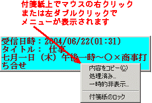 付箋紙メニューとは 付箋紙自体の動作をセットするためのものです。通常の付箋紙プログラムと異なり、@付箋紙の付箋紙は独立したプログラムとなっています(このようにすることにより、付箋紙自体の機能を向上させることがより簡単に行えるようになるため。また付箋紙は何枚までと言う制限が必要なくなる(メモリーが続く限り付箋紙を張り付けられるようになる)。 付箋紙メニューは付箋紙のウィンドウ上にマウスのカーソルを持っていき、右クリックまたは左ボタンをダブルクリックすることによって選択できるようになります。 ![]() 以下にそれぞれの機能の概要を示します。